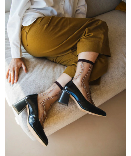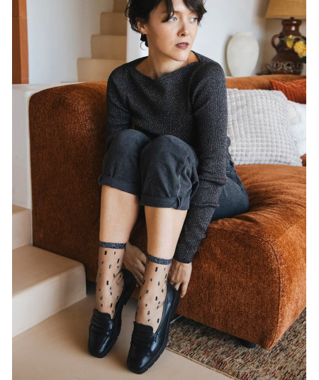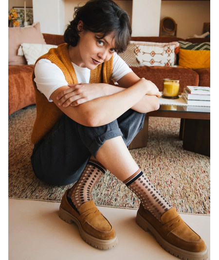 Crescent Dunes Noir ou Marron, un classique intemporel. Ce modèle sobre et élégant s'inspire des panneaux solaires traquant le soleil au cœur du Nevada. Une chaussette à pois noirs et blancs qui viennent épouser votre cheville en toute finesse. Pleine de chic, elle se portera à merveille avec des mocassins et une jupe ou un pantalon carotte noir.